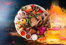 1650 г • Люля-кебаб классический, люля-кебаб куриный, свиная корейка, куриные крылья и бедро на гриле; картофель с розмарином, капуста по-гурийски, маринованные черри и огурцы, овощи гриль; соусы: сацебели, сладкий чили и мацони; лук и свежая зелень.