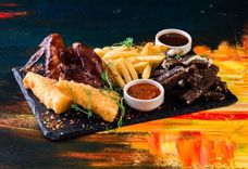 730 г • Куриные крылья гриль, сырные палочки, гренки с сулугуни, картофель фри, томаты черри; соус барбекю.