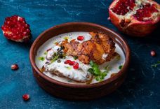 300 г • Нежное куриное бедро, запечённое в сливочно-сырном соусе мацони с чесноком и пряностями.