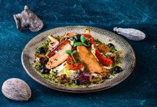 230 г • Томат, огурец, болгарский перец, салатная смесь, оливки, сыр фета. Заправка на основе бальзамика и зелёного масла.