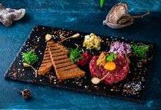 230 г • Нежная говядина с каперсами, солёным огурцом, красным луком и французской горчицей. Подаётся с гренками из чёрного хлеба и перепелиным желтком