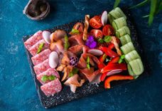 270 г • Полендвица, прошутто, сырокопченая колбаса; томаты черри, болгарский перец и огурец, маслины и оливки, сыр чеддер, гренки из бородинского хлеба, хрен, лук-порей фри.