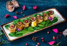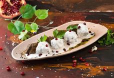 250 г • Нежные виноградные листья, фаршированные начинкой из отборной говядины и свинины с рисом, грузинскими специями и зеленью, подаются с соусом мацони.