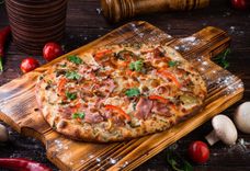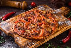 430 г • Авторская лепешка с соусом цахтон, сыром сулугуни, куриным филе и гуанчале, томатами, красным луком, вешенками, болгарским перцем и грузинскими специями.